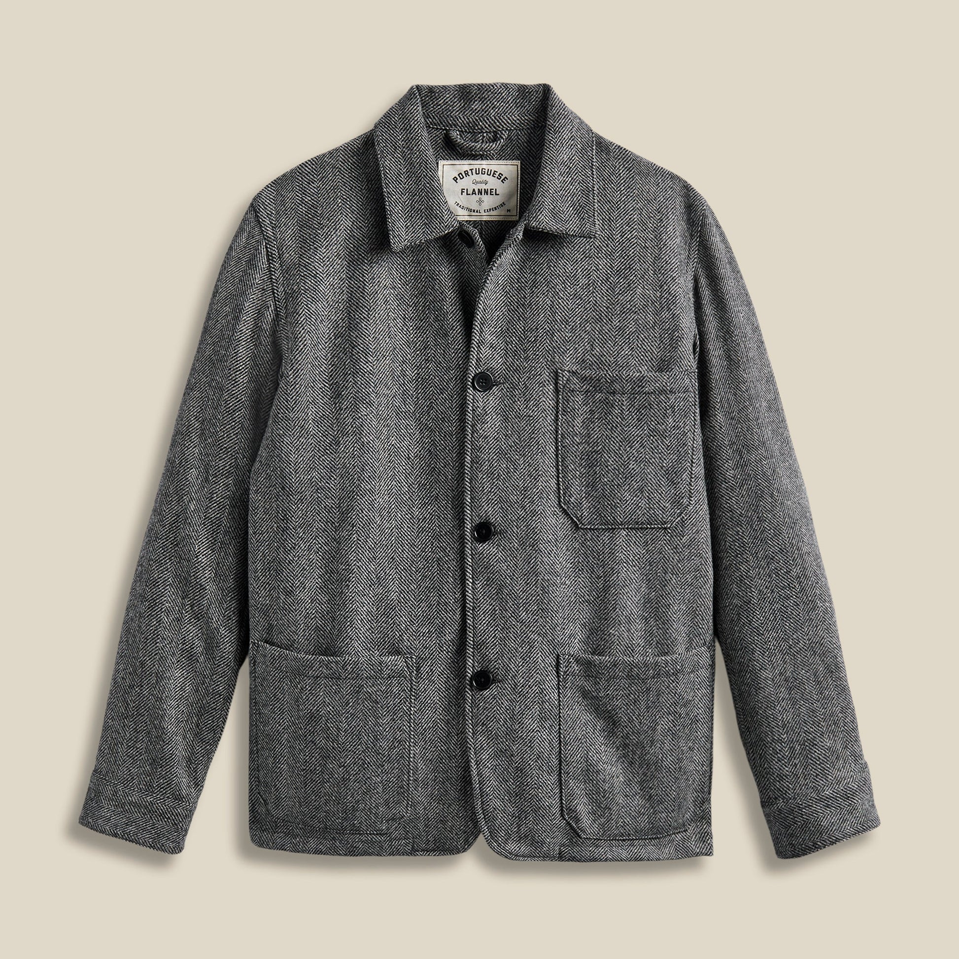 100% virgin wool chore coat in a versatile navy with a great, subtle herringbone pattern. 3 front pockets keep your phone and wallet or your Field Notes secure and at easy reach.